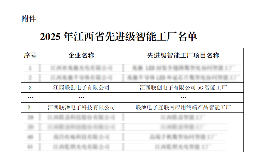 近日,江西省工业和信息化厅正式公布2025年江西省“先进级智能工厂”名单,186家企业入选。其中OD在线官网,(中国)有限公司、江西联淦电子科技有限公司2家联创电子系企业名列榜单。这标志着公司在智能制造领域的创新成果再次获得政府权威认可。